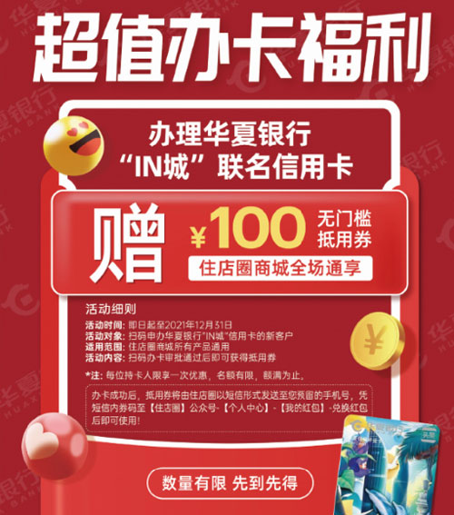 同時(shí)辦理華夏銀行“IN城”聯(lián)名信用卡,還贈(zèng)住店圈全場(chǎng)通用100元無(wú)門檻抵用券,超值福利火熱來(lái)襲。