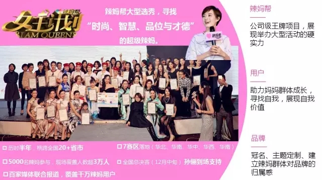 辣媽幫自2015年起與全國婦聯(lián)展開了為期五年的獨(dú)家合作,希望通過此舉打通全國醫(yī)務(wù)渠道,尋找到源頭用戶,將孕媽媽人群培養(yǎng)成為孕期伴侶、辣媽幫用戶,并通過社區(qū)固定用戶行為,利用辣媽商城、荷花親子將其有效轉(zhuǎn)化為購買人群。辣媽幫與全國婦聯(lián)的深度合作,每年將影響到1500多萬的孕媽媽,而這其中500多萬人會被轉(zhuǎn)化為辣媽幫用戶。